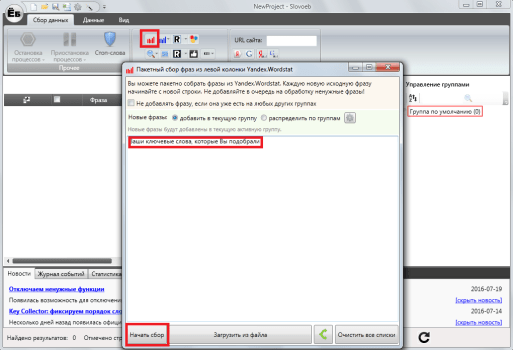 Жмем красную кнопку “Пакетный сбор фраз” в левой колонке Yandex.Wordstat и вписываем туда подобранные вами ключевые слова. Затем нажимаем кнопку «Начать сбор» и программа СловоЁБ приступит к сбору ключевиков в автоматическом режиме. Вообщем делайте как на скриншоте: