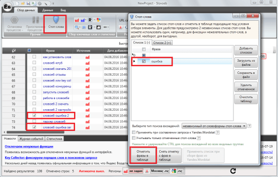 Например, у Вас лишними будут запросы содержащие слово “ошибка“. Внесите его в фильтр и нажмите “Отметить фразы в таблице“. И эти фразы будут отмечены галочкой в таблице для сбора. Затем их просто удалите.